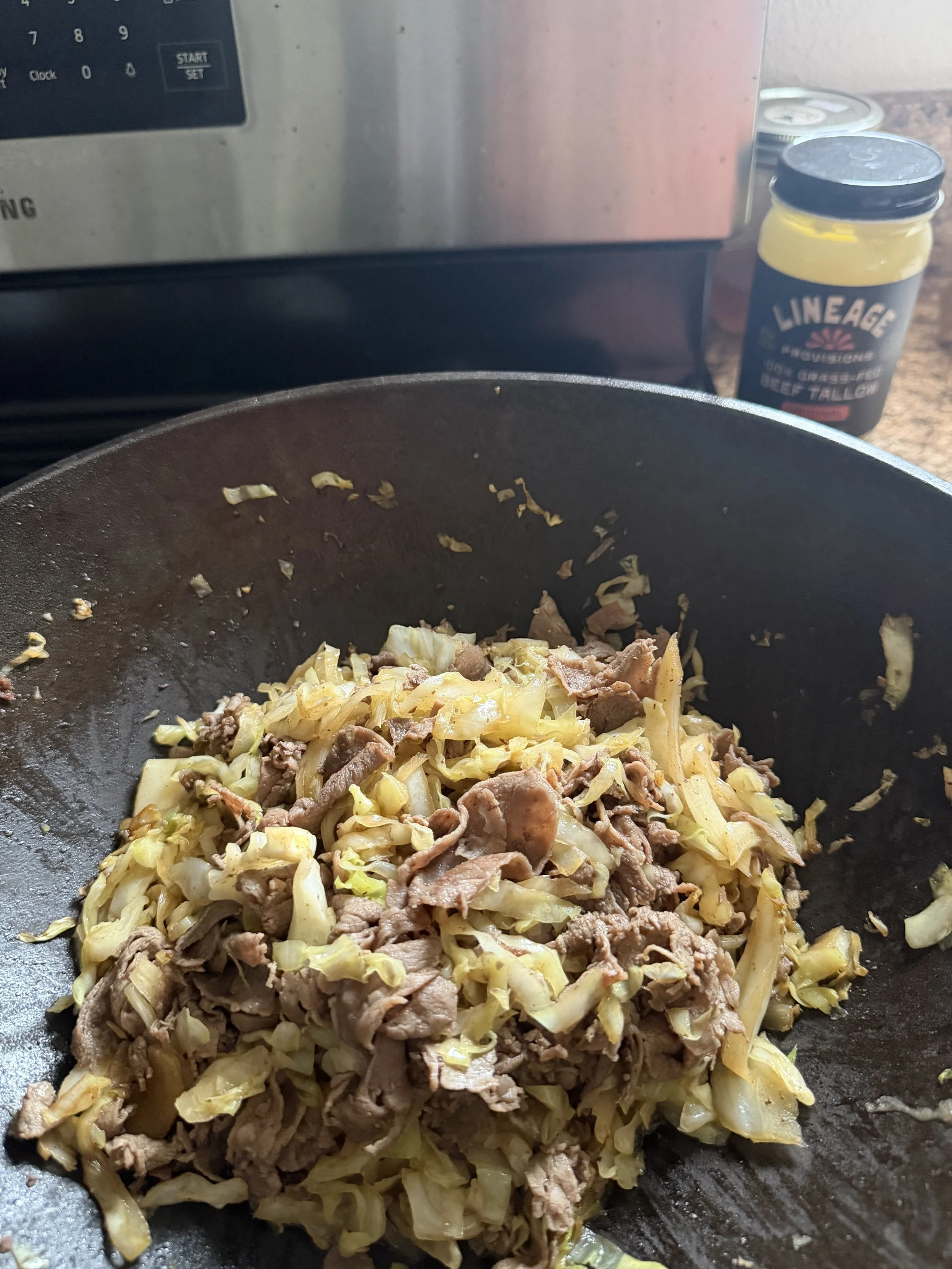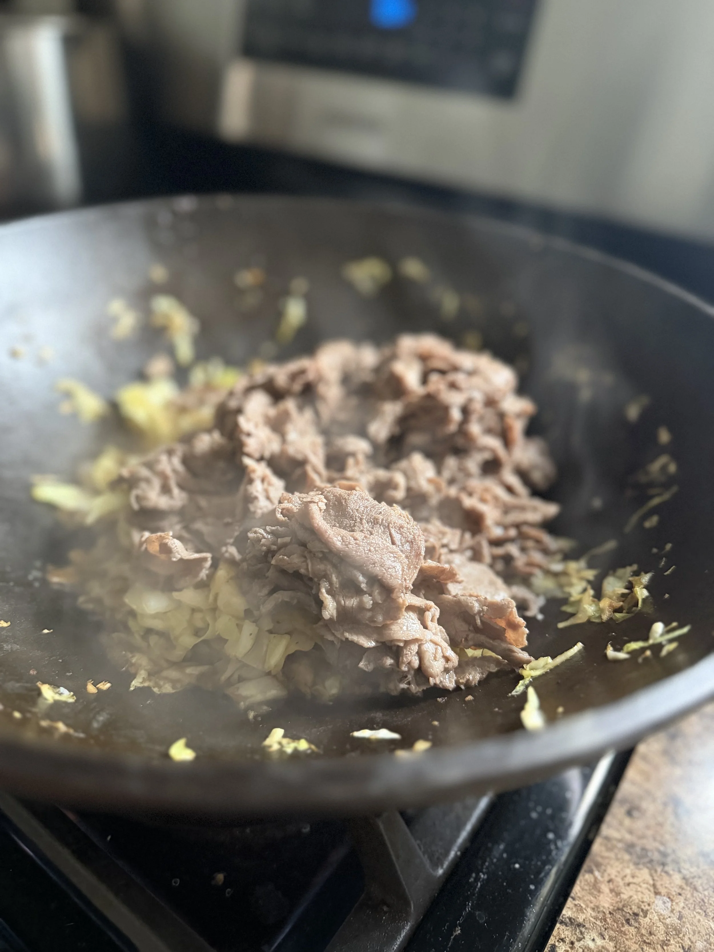Add back the beef on top of the pile of veggies. Let it sit undisturbed for 3 min before final toss so cabbage slightly browns.