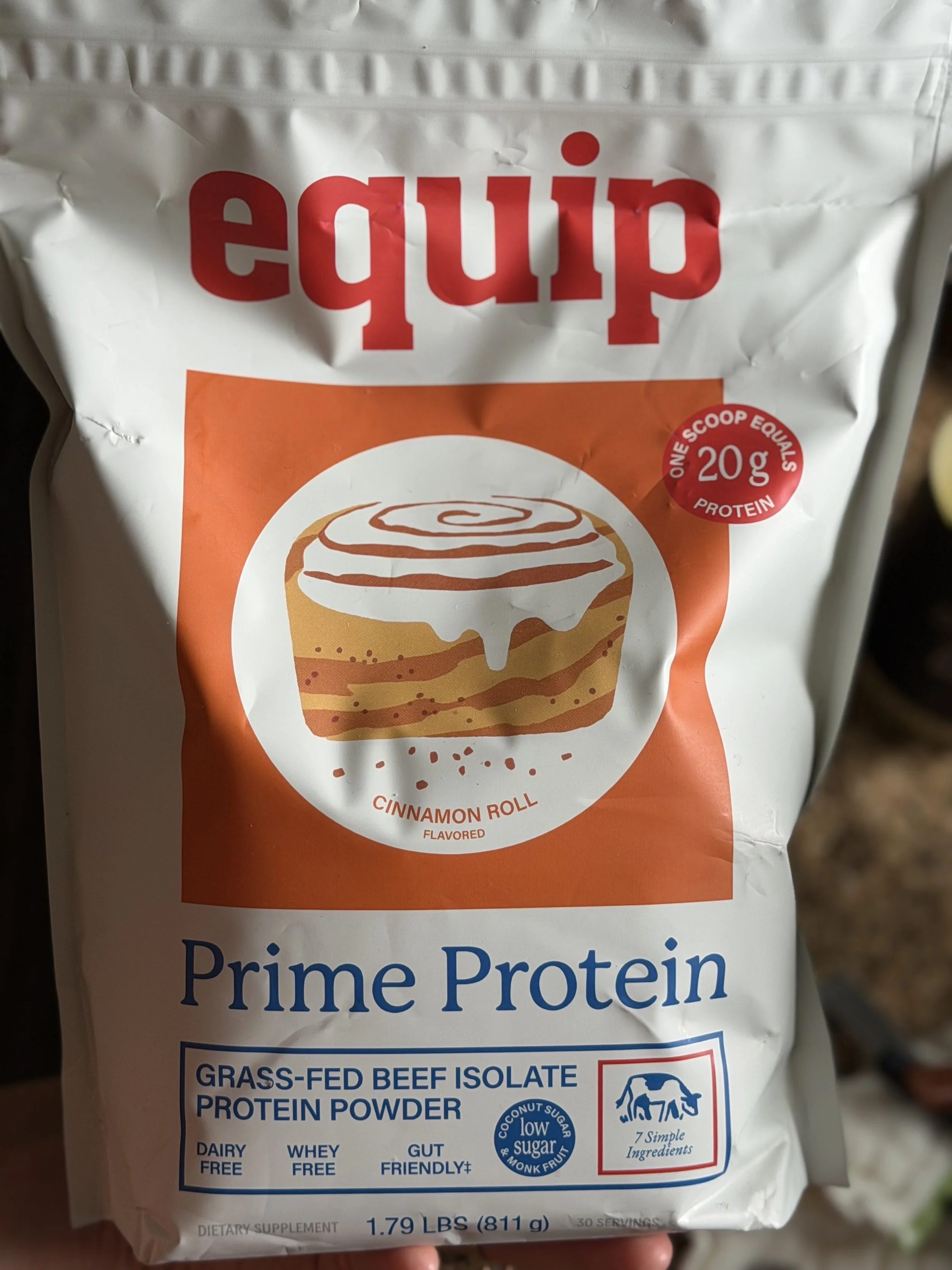 clean grass-fed cinnamon roll protein powder from Equip Foods. (Note: this protein is not recommended for those with tree nut allergies)