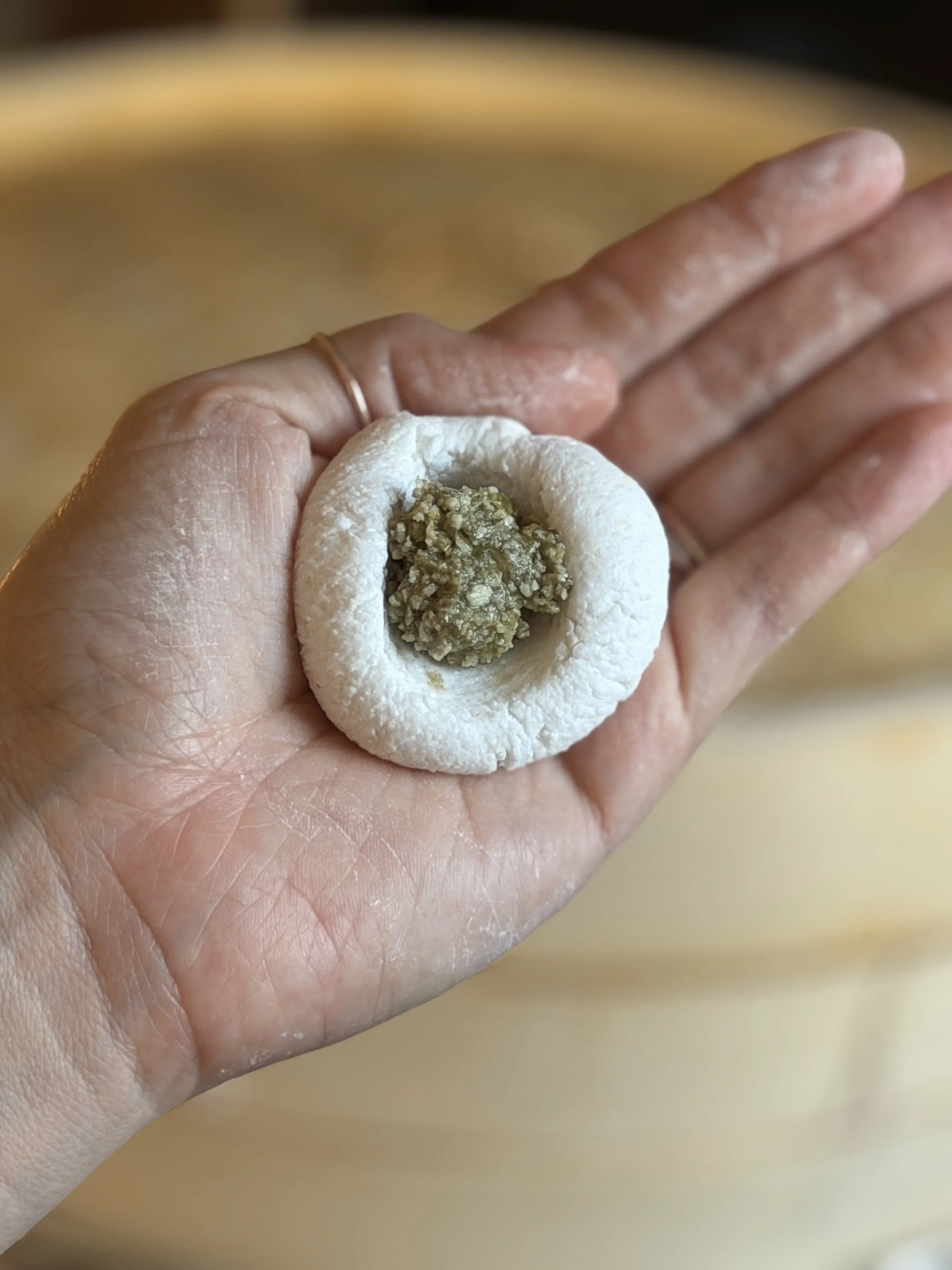 Press/hollow the center to form small bowl. (If it cracks add a little bit more warm water to the dough)