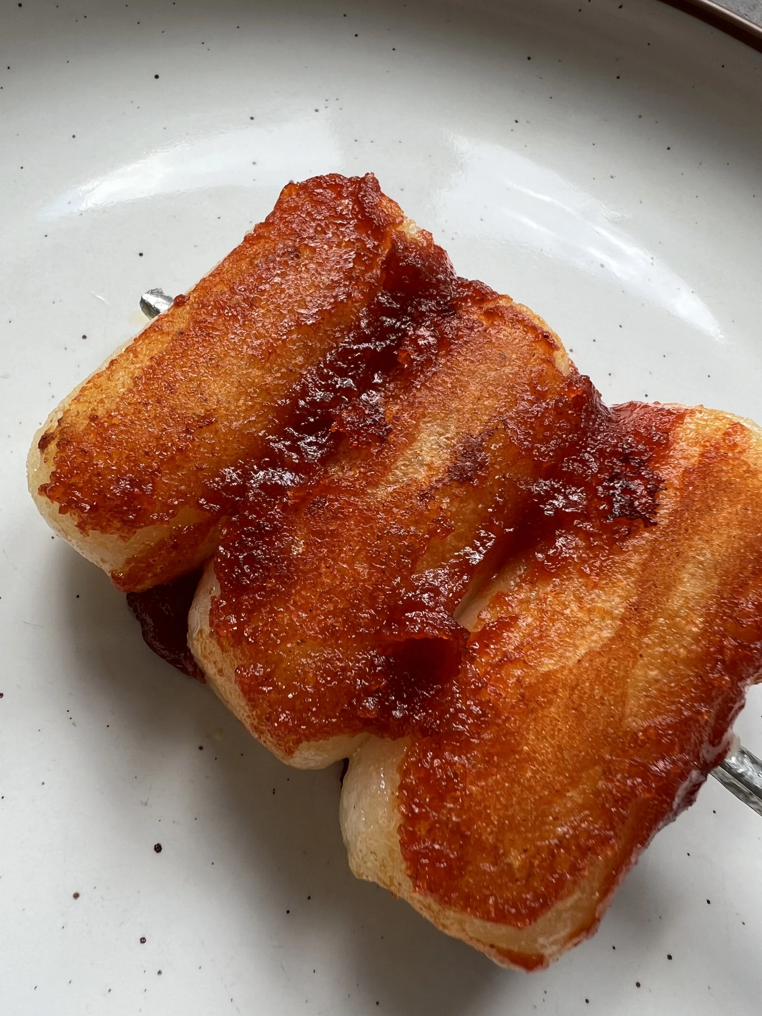 Skewer the rice cakes (3 per skewer). Pan-fry for 4 minutes per side until lightly golden.