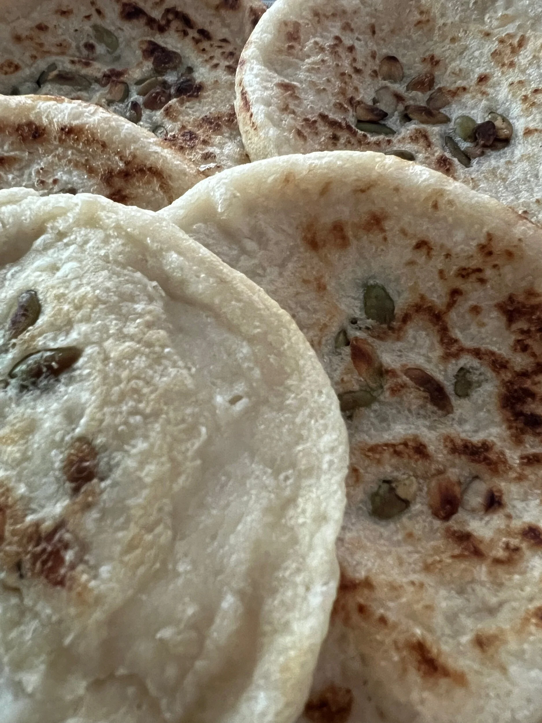 When the pancake edges are cooked and the center is still a little gooey, sprinkle some pumpkin seeds, and flip